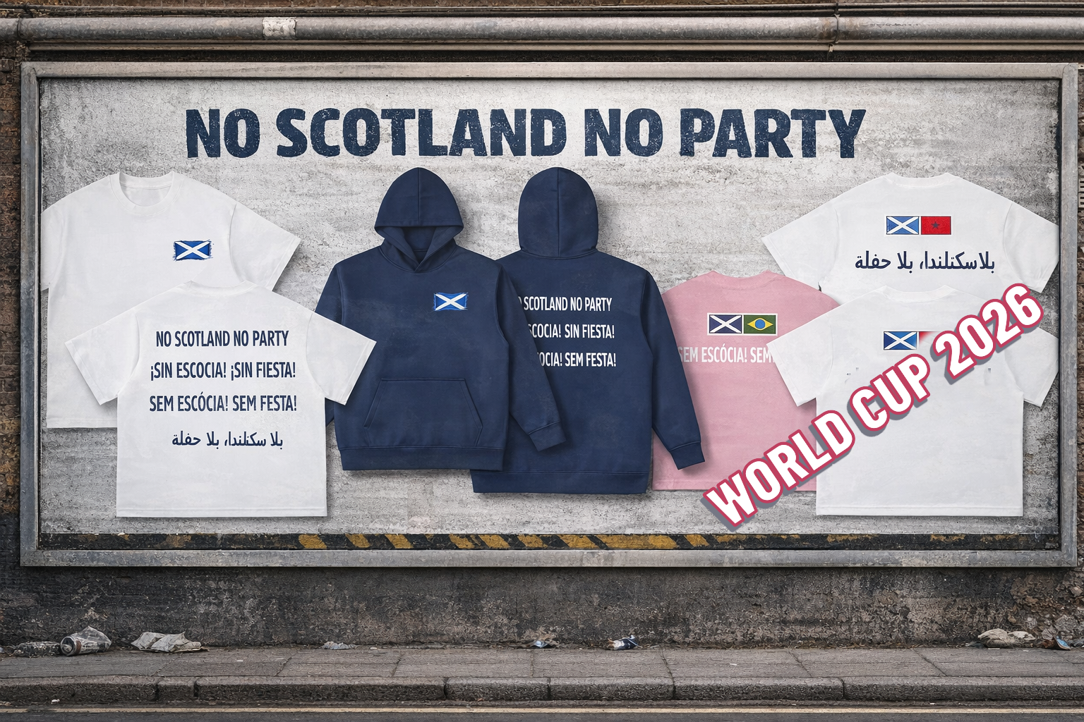 White cotton t-shirt designed for fans to wear for the Scotland v Haiti, World Cup group stage game with 'No Scotland No Party' in Spanish language